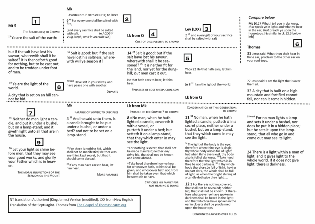 So, next we ask, “Where did Mark and Q get their material from?” The first disciples and other followers of Jesus in Palestine would have rehearsed sayings and events they remembered. From these beginnings, the oral traditions about Jesus developed. The sayings were used by the early Christians in different circumstances, and the sayings were adapted and explicated. Some remained isolated, but others were gathered together, perhaps into short documents or into memorable sequences of sayings. These then formed the basic resources of Mark and Q and, indeed, for the supplementary material that Matthew and Luke also added to their gospels. Often these catenas of sayings were held together, not by a string of logical connections but by a series of catchwords that they shared. Sometimes the same word was the catchword across the string of sayings, sometimes a new catchword would be picked up from the end of one saying to make a fresh link to the next saying. There is a long series of sayings like this in Mark 9 that ends with the salt sayings (labelled 2 on the sheet). The series of three sayings in Mark 4 are a short example: it begins with light, then the catch-thought is hiddenness, and then about hearing secrets. In Luke 11 in line 7 the sequence of four sayings from verse 33 to 36 is linked by the word ‘light’.